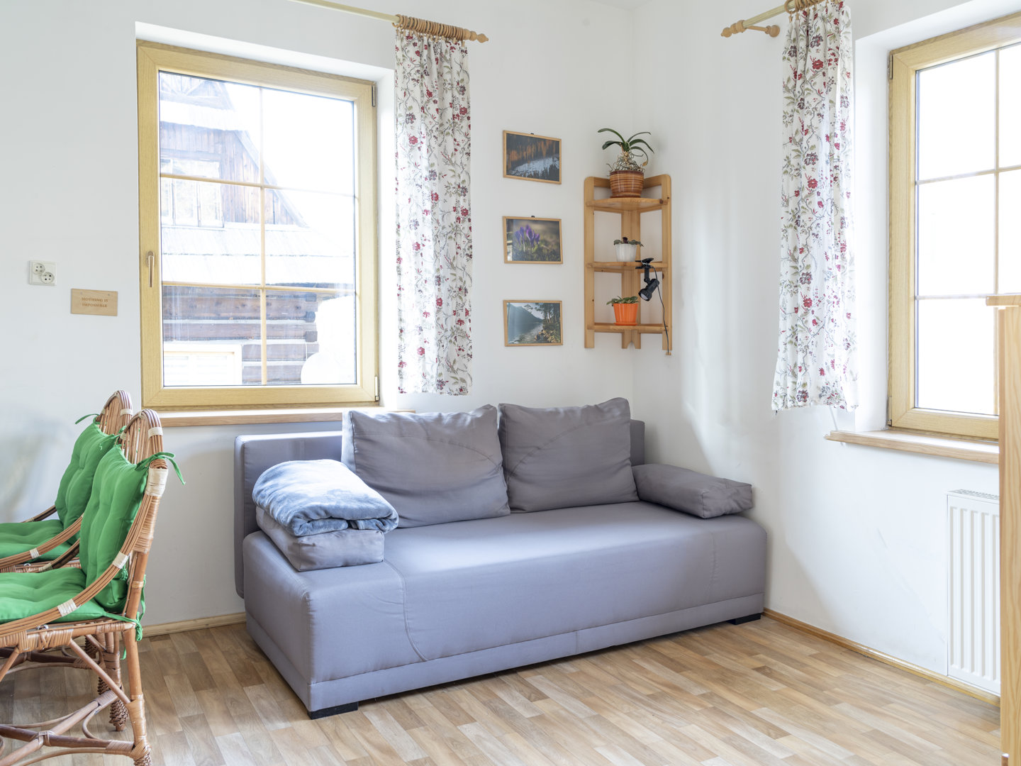 W jednym z pokoi jest łóżko małżeńskie, w drugim rozkładana sofa dwuosobowa oraz aneks kuchenny.